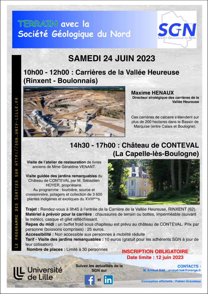 Il reste quelques places pour l’excursion SGN(association dont nous sommes partenaire) du 24 juin 2023 dans le Boulonnais (visite des carrières de la Vallée Heureuse à RINXENT et des jardins remarquables du château de CONTEVAL ainsi que de l’atelier de restauration de livres anciens de Géraldine VENANT, situé dans l’enceinte du château) (la Capelle-lès -Boulogne). Tous les détails et informations sont sur l’affichette en pièce jointe.