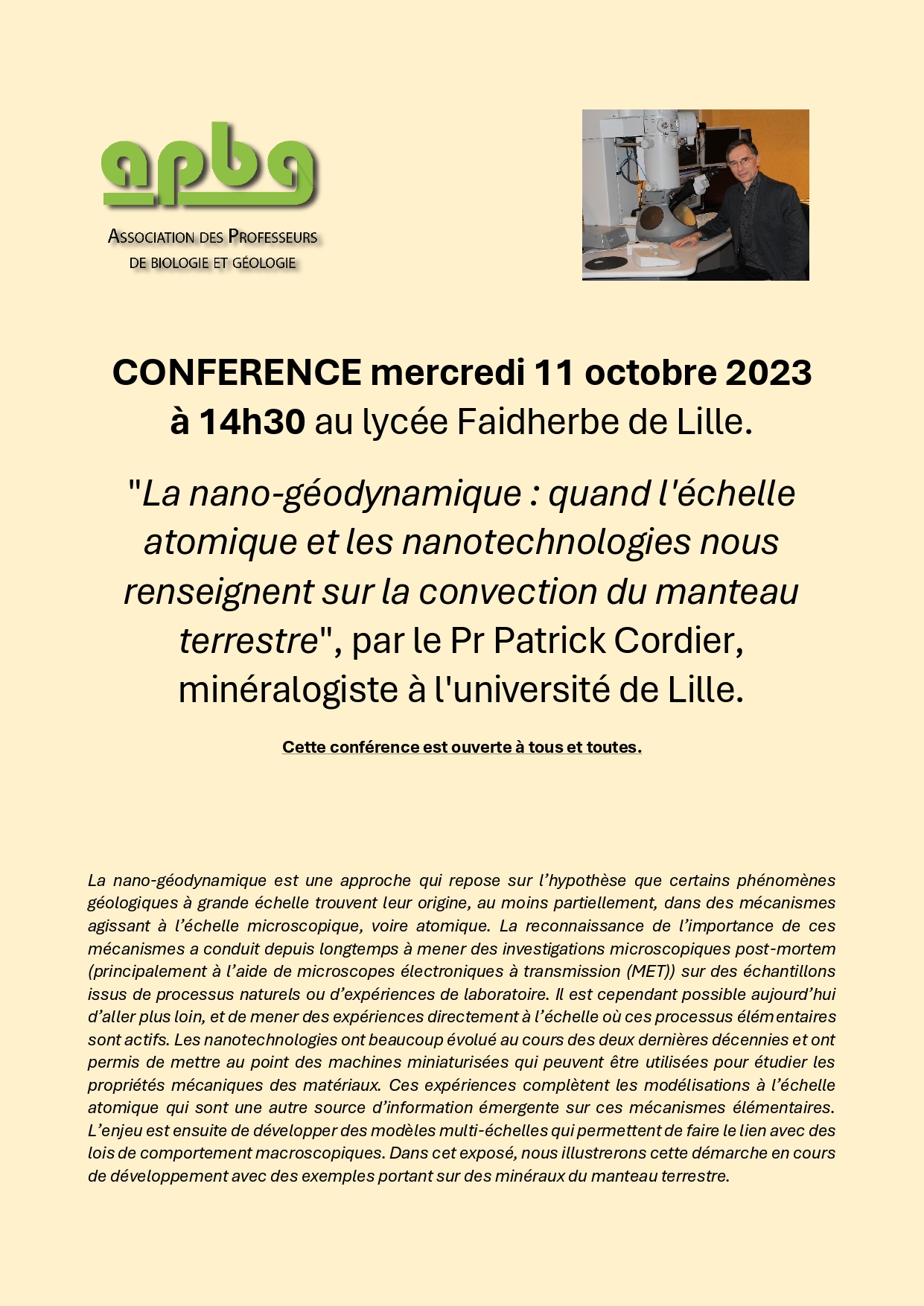 Conférence le mercredi 11 octobre 2023 à 14h30 « La nano-géodynamique, quand l’échelle atomique et les nanotechnologies nous renseignent sur la convection du manteau terrestre »